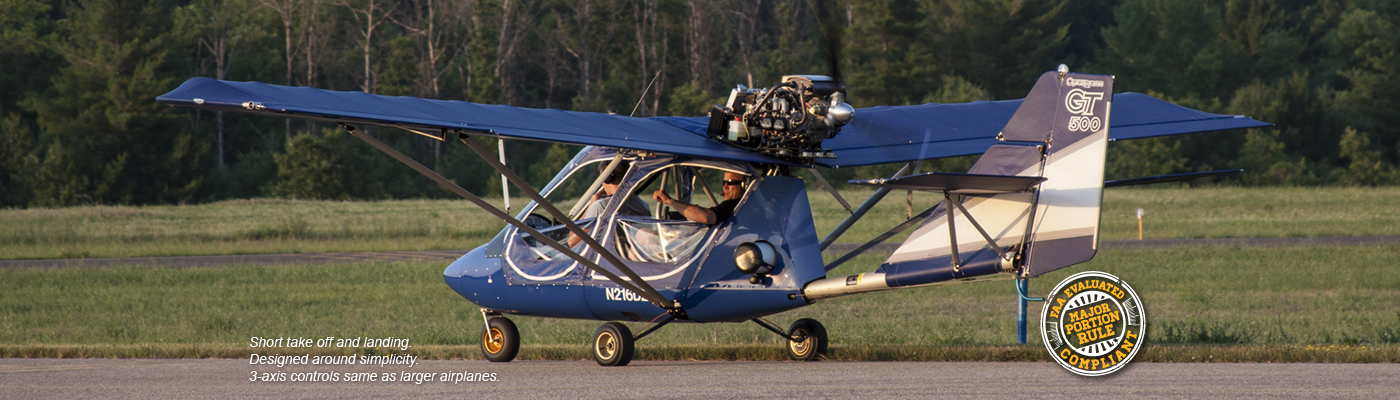 The GT 400 has spring loaded landing gear, four position flaps, state-of-the art gear suspension, and a virtually vibration-free engine mount. The GT 400 has one of the lowest cockpit noise level of all ultralights tested and can cruise at 58 mph.